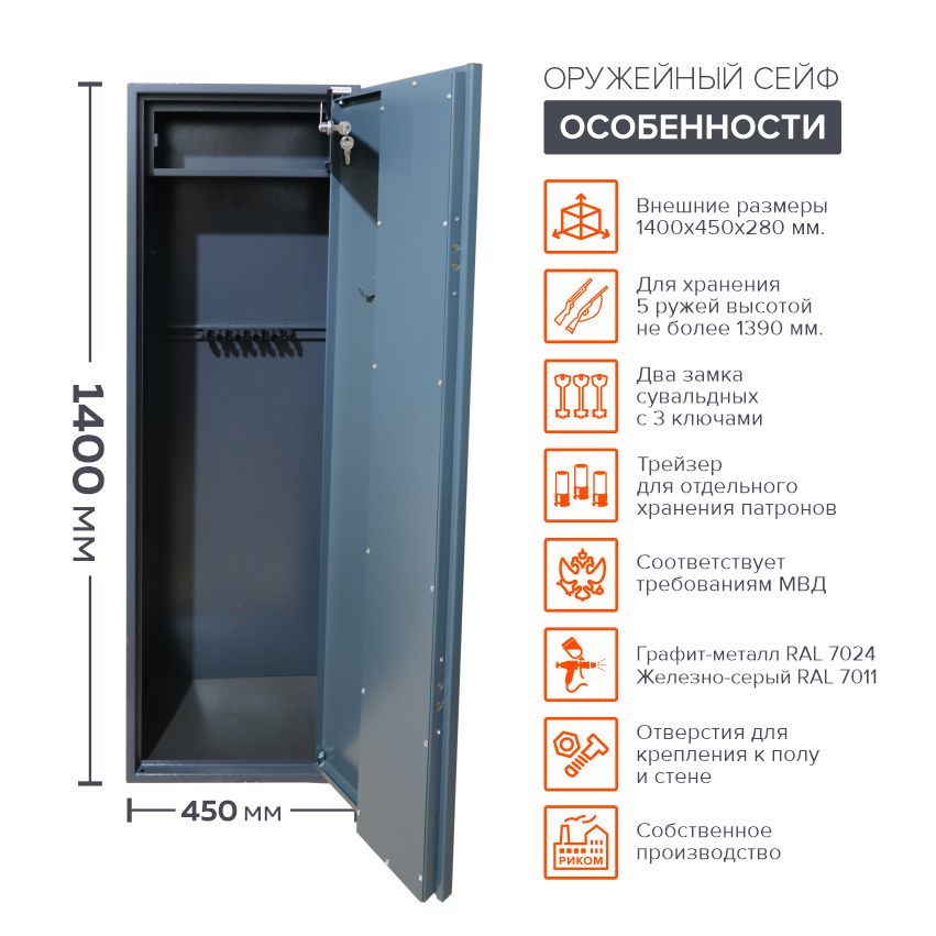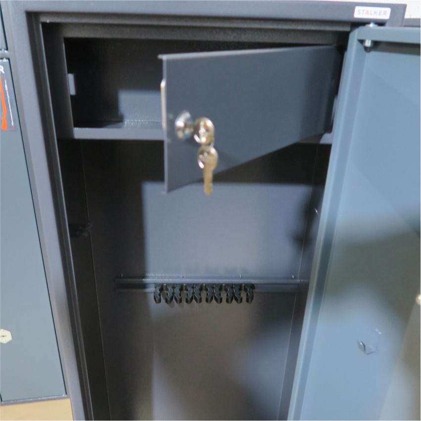 - Шкафы оборудованы отделением для патронов (трейзером), запирающимся на ключ и ложементами (держателями) для ружей.